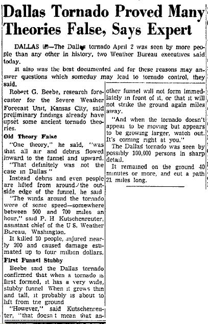 On April 10, 1957, many newspapers around the nation carried this AP piece quoting Weather Bureau meteorologist Robert G. Beebe, who was to go on to prepare the Bureau's official report on the tornado. The talk about tornado control and the over-stated wind speeds probably are testimony more to the immediate excitement the storm caused among the meteorological community and to the state of tornado science at the time than to anything else (this clipping is from the Newark Advocate). |